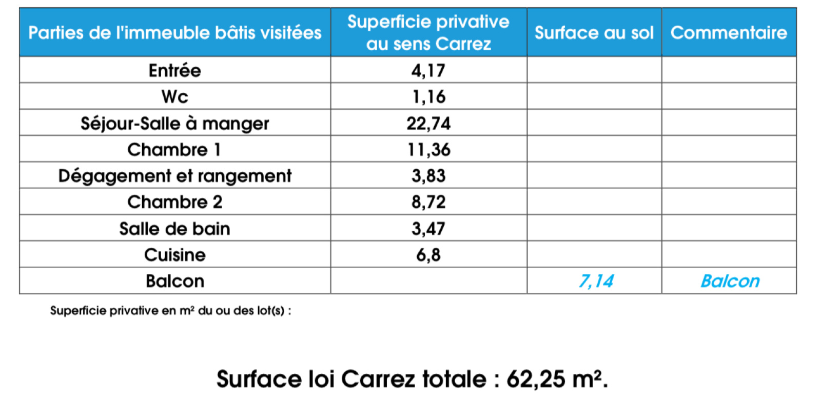 Surface habitable : 62,25 m². Balcon : 7,14 m².