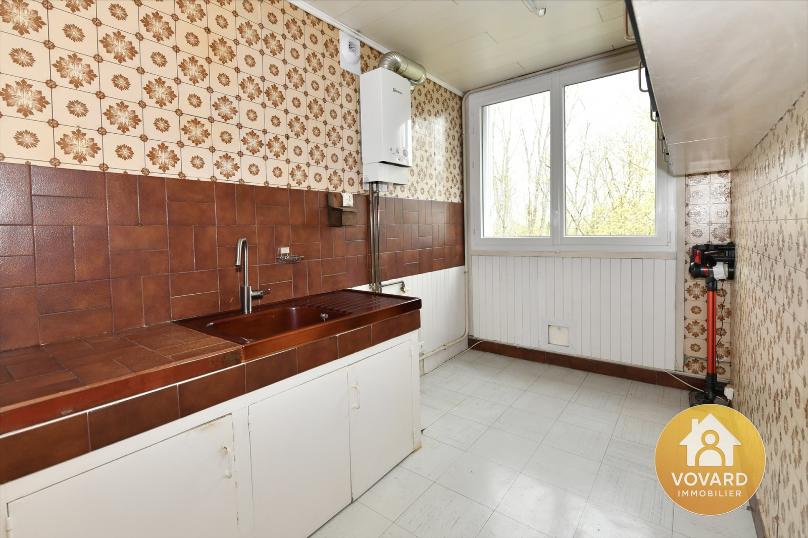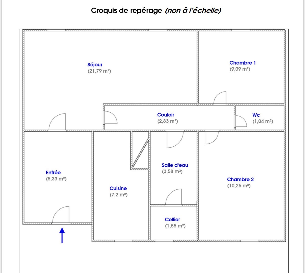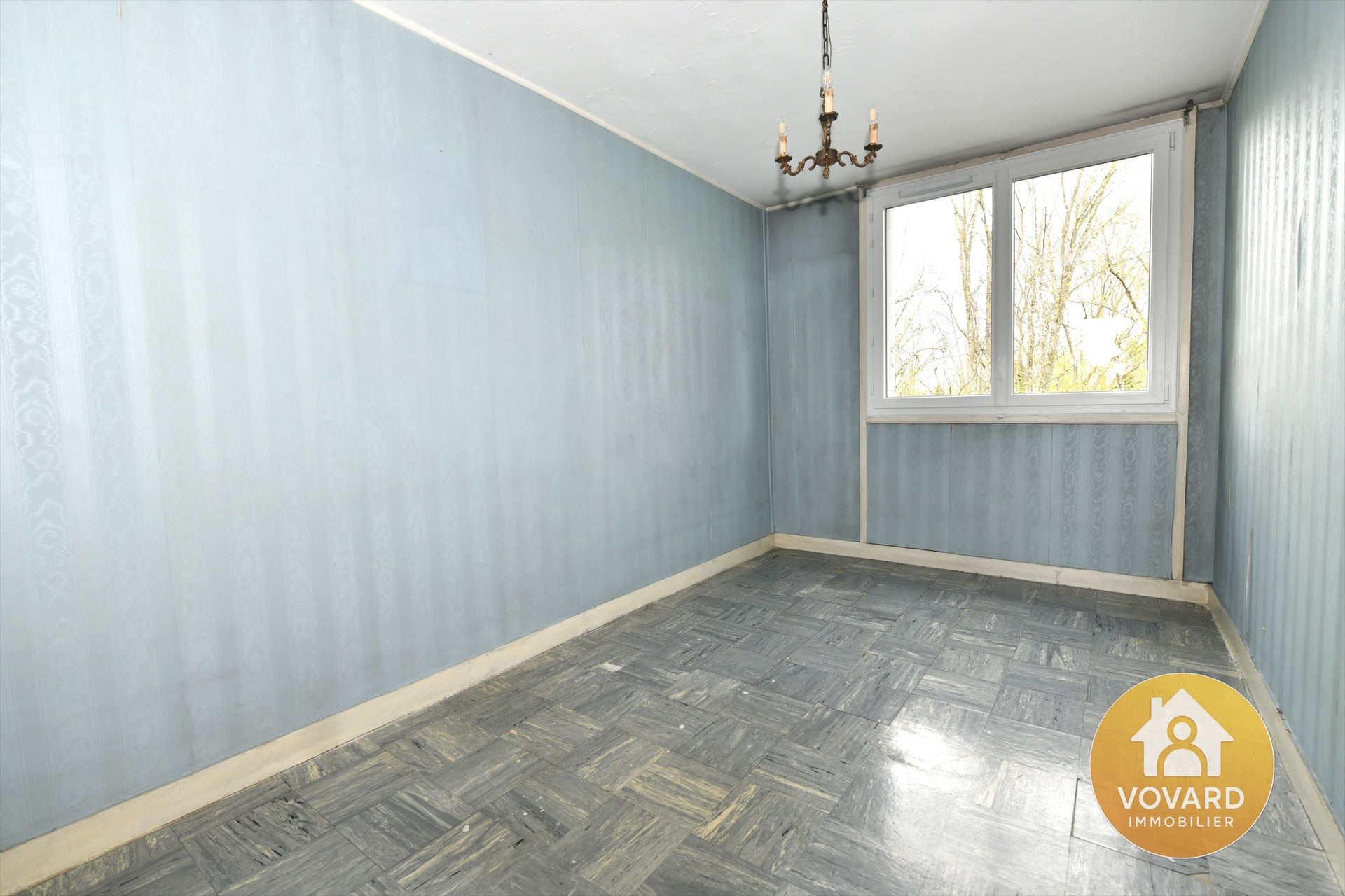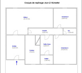 Vaste F3 comprenant une belle entrée avec placard, un séjour double de 21,79 m², une cuisine séparée, un dégagement, deux chambres (9,09 m² et 10,25 m²), une salle de bain, des WC indépendants, un cellier.