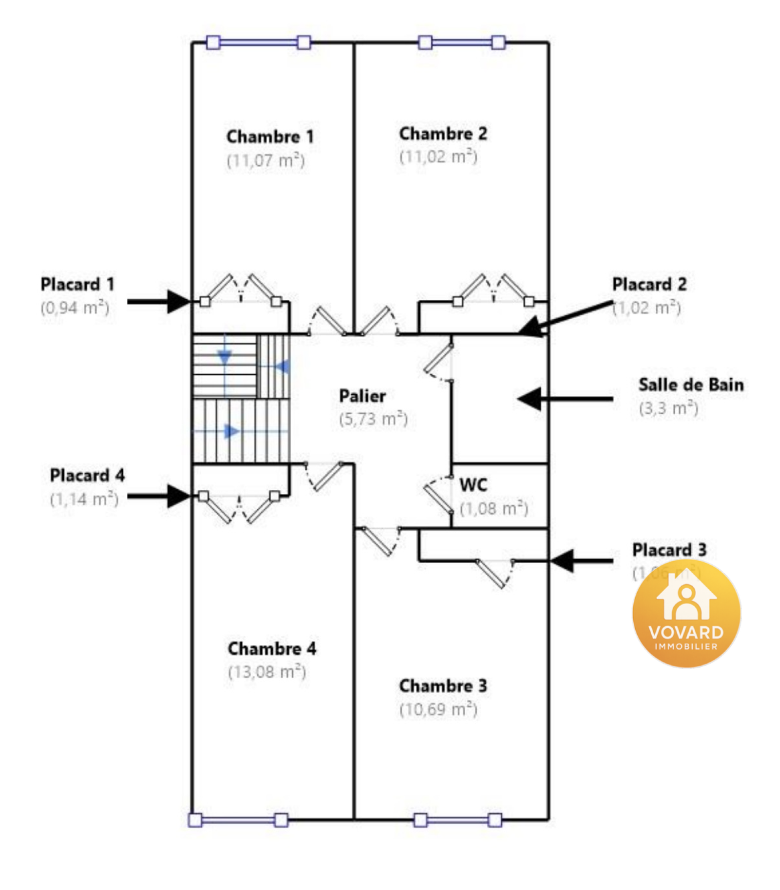 A l'Étage - Palier desservant 4 chambres avec placard (de 11 à 14 m2), salle de bain et wc séparé.