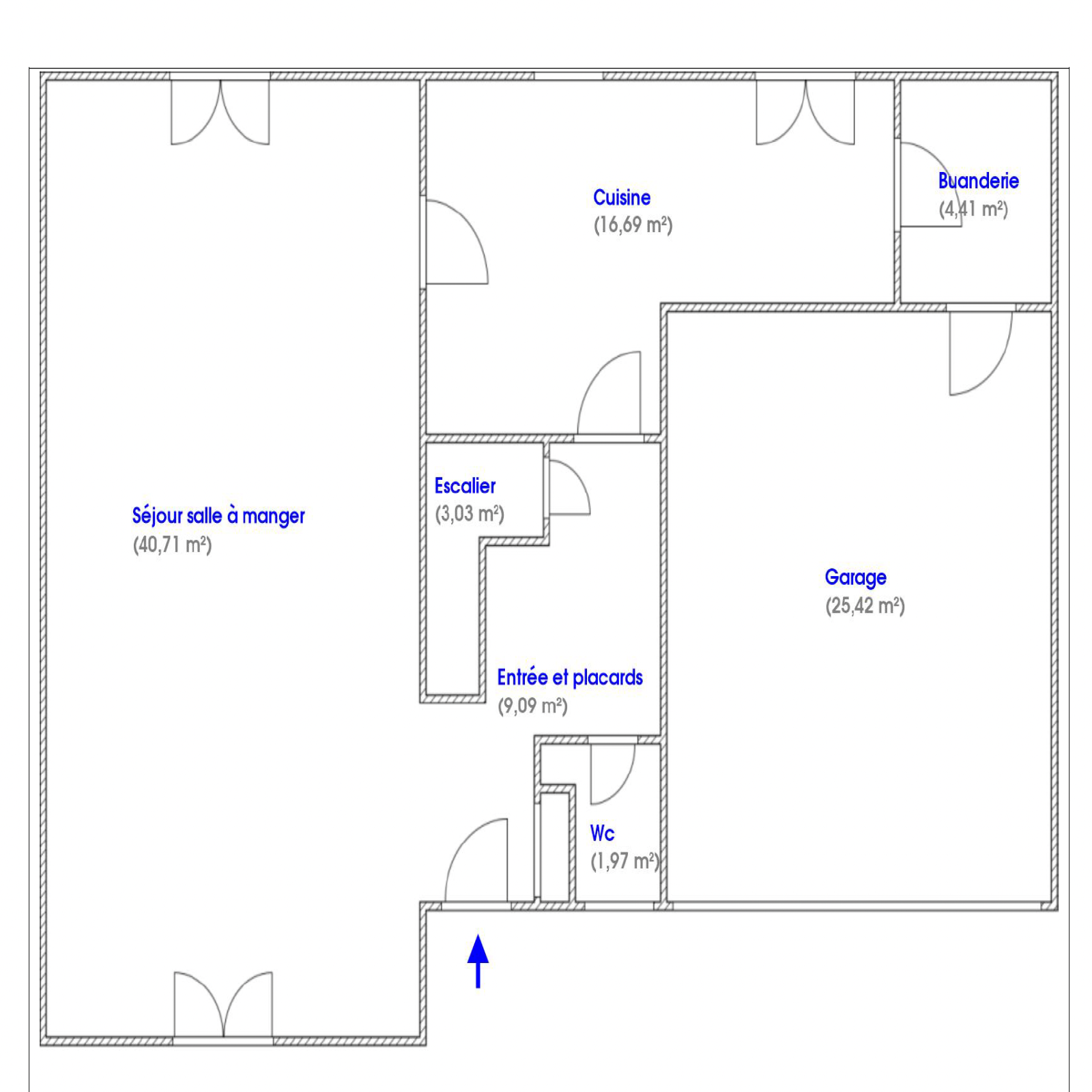 L’entrée et ses placards (9,09 m²) mènent à un vaste séjour-salle à manger de 40,71 m², lumineux et traversant grâce à ses grandes ouvertures. La cuisine indépendante de 16,69 m² bien agencée, est complétée par une buanderie de 4,41 m². Un garage de 25,42 m² et un WC séparé complètent le rez-de-chaussée.